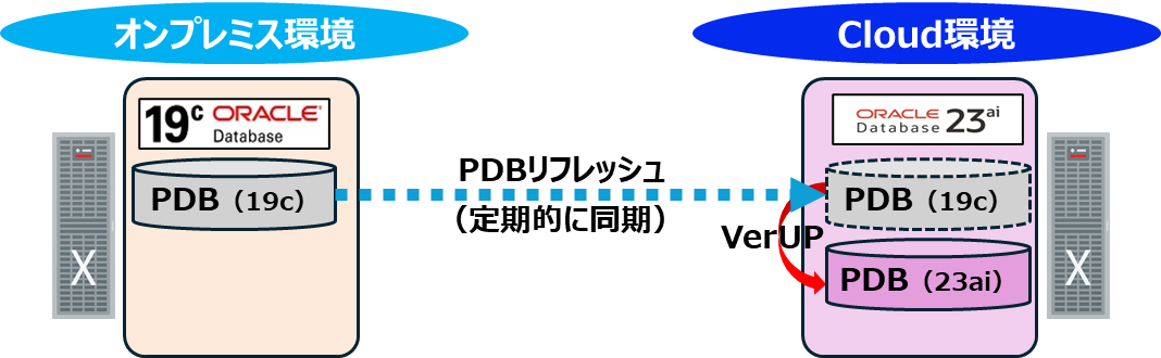 オンプレミスから最短で移行するために事前にOracle Database 23ai上にPDBをクローン。最終同期後バージョンアップをすることで大規模データベースを短時間でバージョンアップ