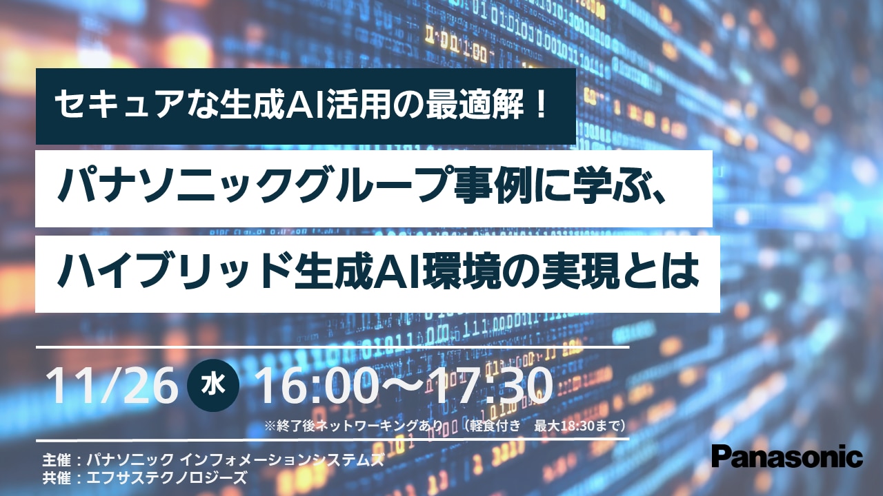 生成AIの導入が進む一方で、情報漏洩や専門人材の不足が課題です。 本セミナーでは、パナソニックグループのDXを推進するエンジニアが、グループにおける生成AI活用で培ったノウハウや事例を紹介します。さらには、セキュリティを担保するオンプレミスと柔軟なクラウドを組み合わせた、ハイブリッドな生成AI環境の構築方法もご紹介します。 機密情報を守りながら業務効率を革新的に高め、さらにコスト削減も実現する「最適解」をお伝えします。