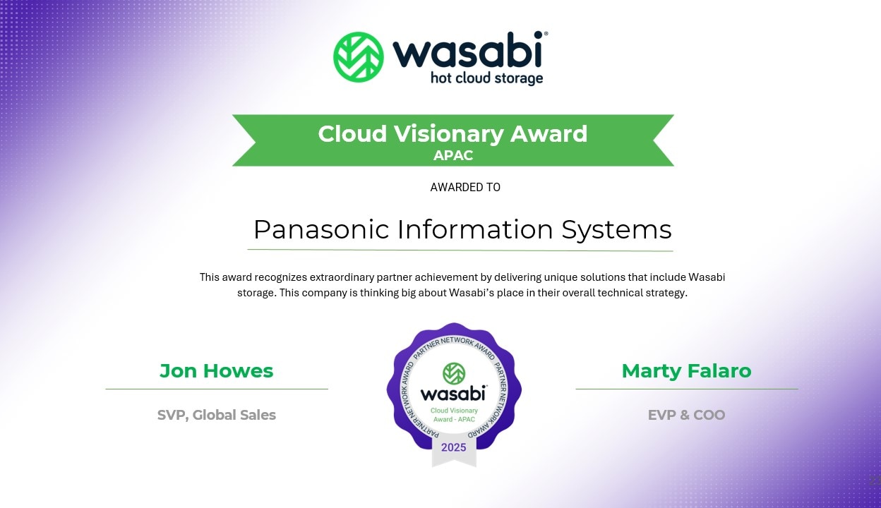パナソニック インフォメーションシステムズ株式会社(以下:パナソニックIS)は、Wasabi Technologies社が主催する「2025 Wasabi Partner Network Awards」において、APAC地域のクラウドビジョナリー賞(Cloud Visionary Award)を受賞しました。本アワードは、「Wasabi Hot Cloud Storage」および「Wasabi Cloud NAS」で構成されるクラウドストレージサービス「Wasabi」を活用し、革新的なクラウドソリューションを提供するパートナー企業を表彰するものです。